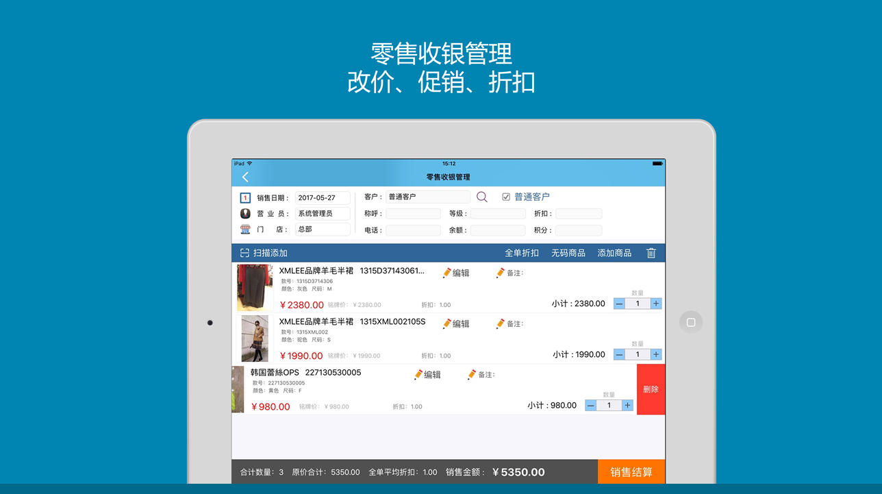 可通過輸入或掃描條碼加入商品到購物車結算,前臺收銀支持批發、零售,支持客戶新增和查詢.