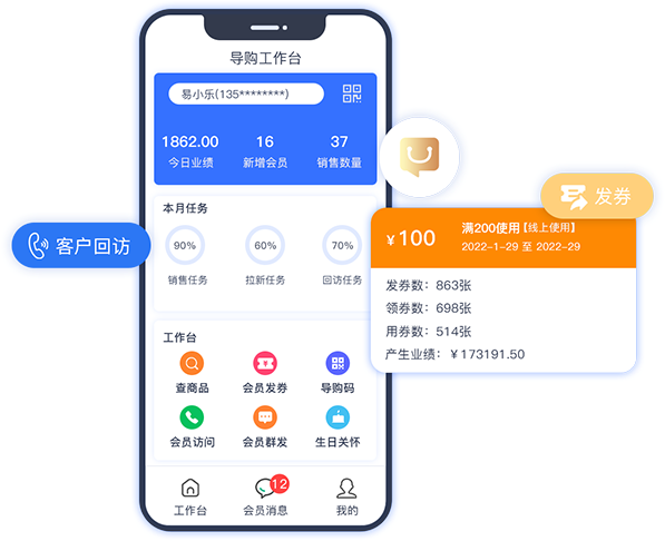 導(dǎo)購平臺(tái)系統(tǒng),通過微信會(huì)員一對(duì)一導(dǎo)購綁定操作,實(shí)現(xiàn)會(huì)員注冊后一定周期的活動(dòng)自動(dòng)推送,售后回訪任務(wù),會(huì)員活動(dòng)軌跡推送等功能。系統(tǒng)分析指標(biāo)包含導(dǎo)購連帶率,加新率,客單價(jià),業(yè)績與目標(biāo)完成度