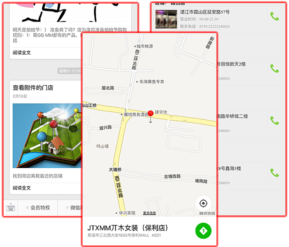 按照所在位置的距離展示各個店面的線下位置列表以及聯系電話等信息。