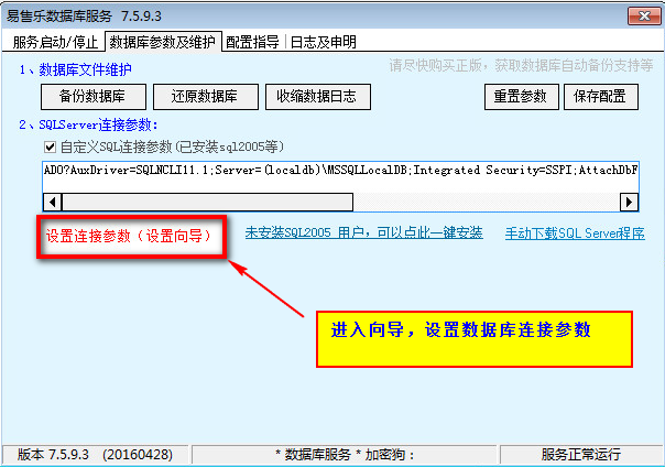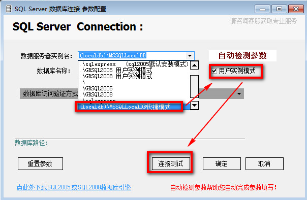 2)點(diǎn)擊設(shè)置連接參數(shù)向?qū)В蜷_(kāi)后。選擇 Sqllocaldb快速方式。連接測(cè)試成功后,確定。